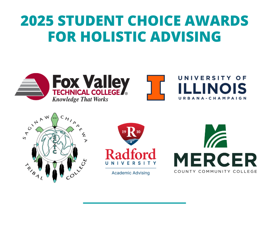 The Student Choice Awards for Holistic Advising recognize postsecondary institutions that have undergone holistic advising redesign efforts supported by cross-functional teams and centering student experiences to increase completion and success indicators for students, including Black, Latino/a/x, Indigenous, Asian, and Pacific Islander students and poverty-affected students.